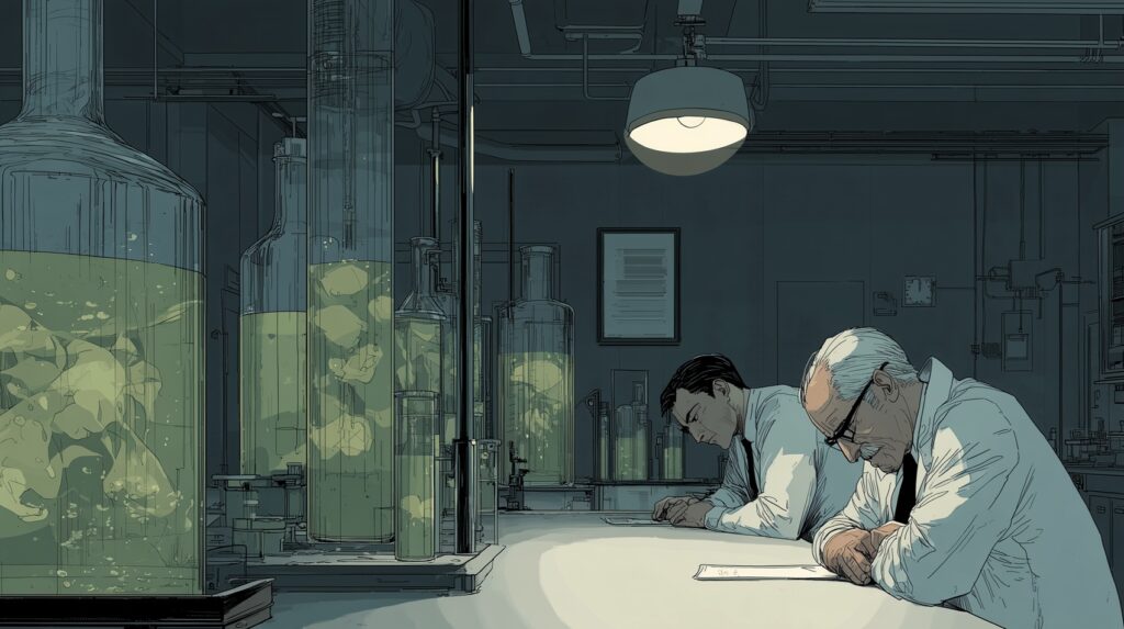 The pipes breathed in the dark. A slow, wet rhythm — lub-dub, lub-dub — that no one in the building seemed to notice anymore. At one corner of the room sat two men, two old friends, across from each other at a white table, their corner lit only by the overhanging light.