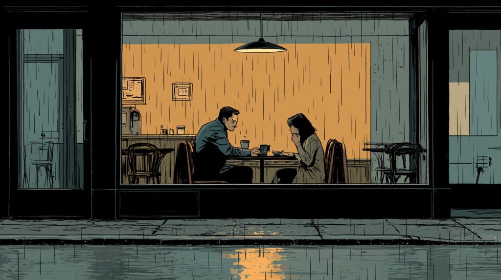 Something tightened in his throat. His nose went warm — the particular, treacherous warmth that came just before. He tried to look elsewhere, to fix his eyes on the rain-blurred window, and then her scent reached him: the perfume they’d chosen together for her birthday. He had three shirt buttons open. He pressed a fourth between his fingers and let it go.